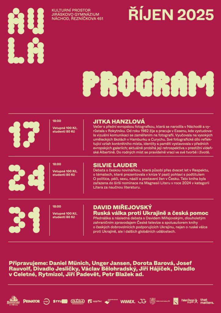 S prvním říjnem přinášíme program na celý měsíc. Aula bude umělecká i aktuální. Těšíme se na Vás!