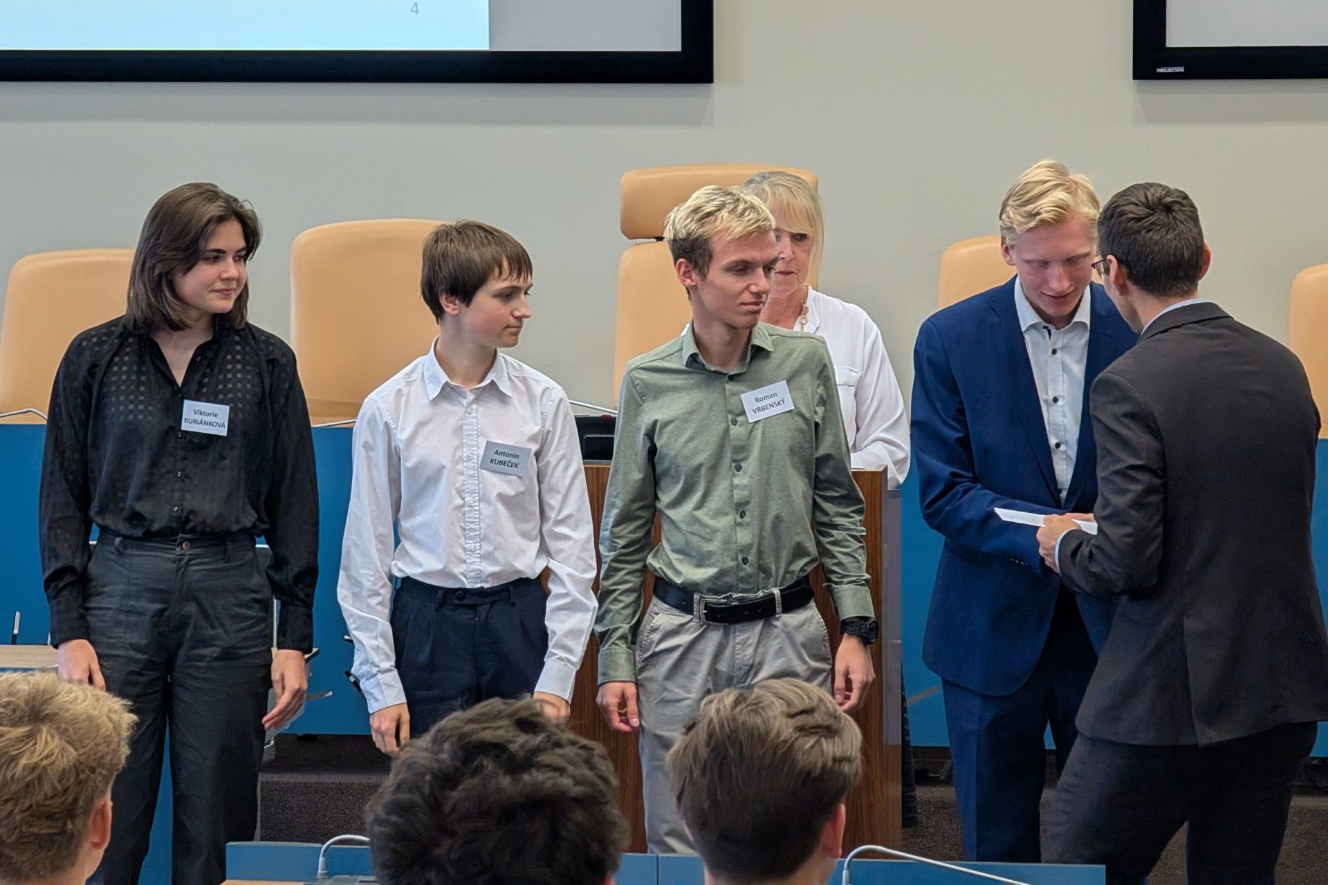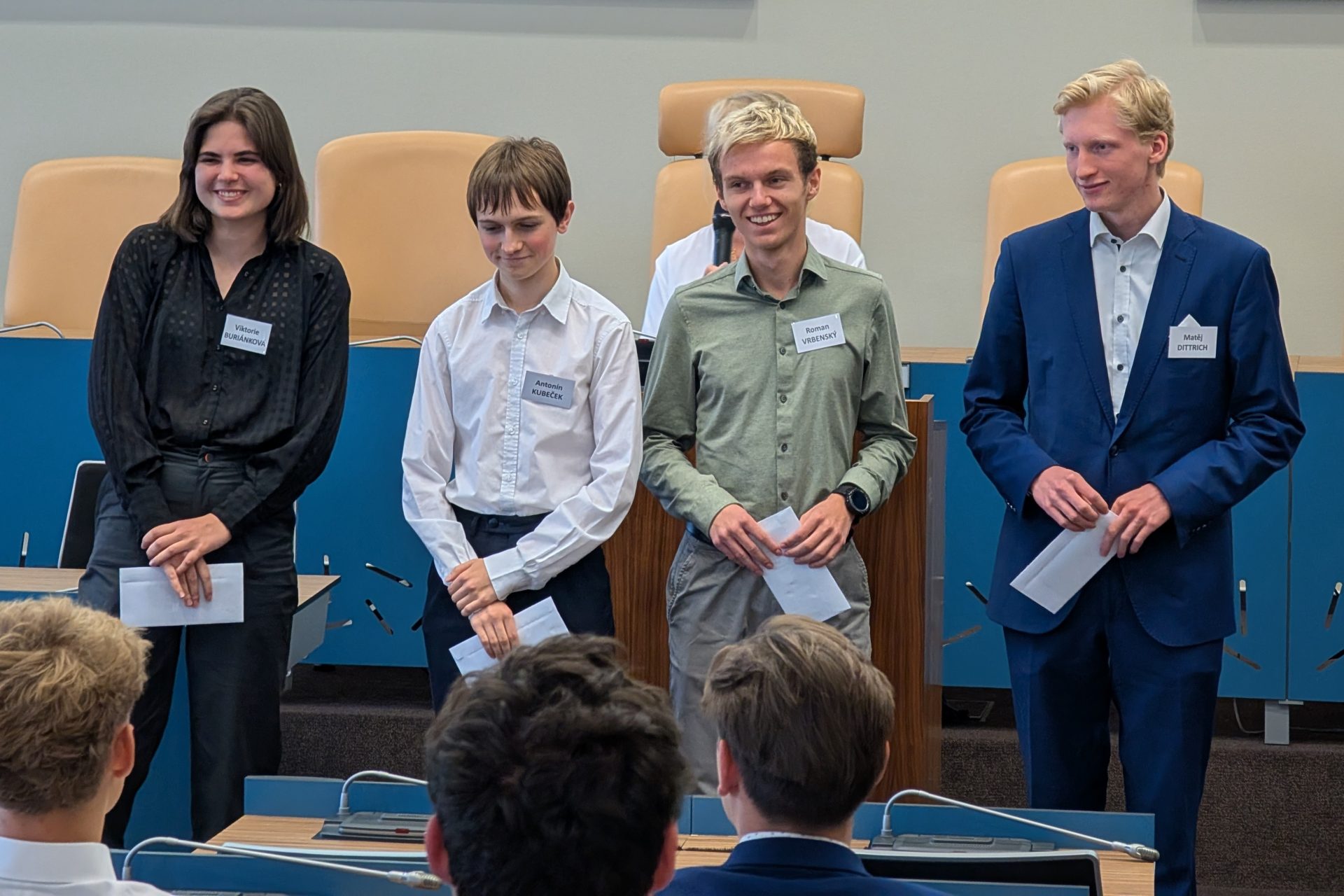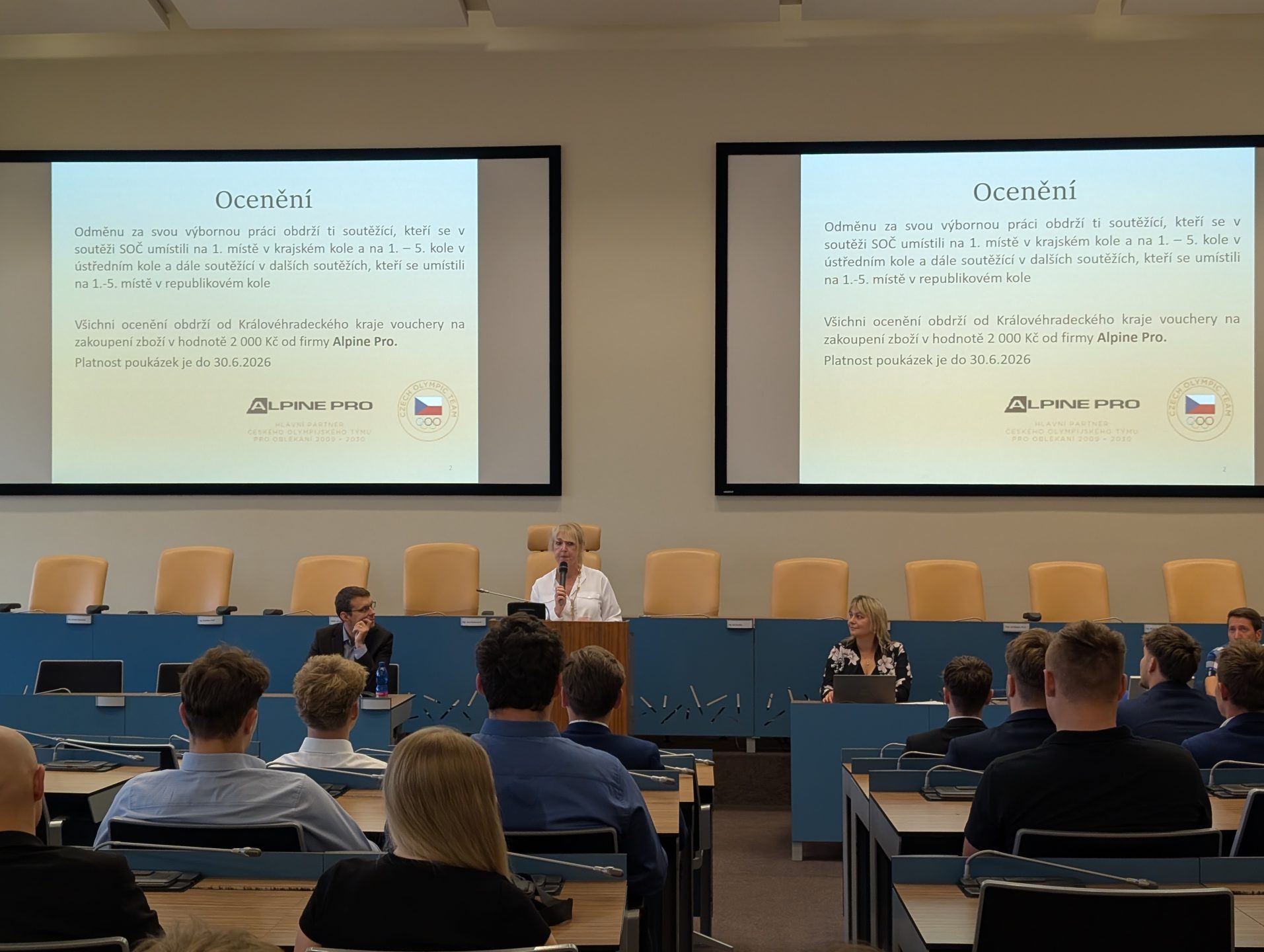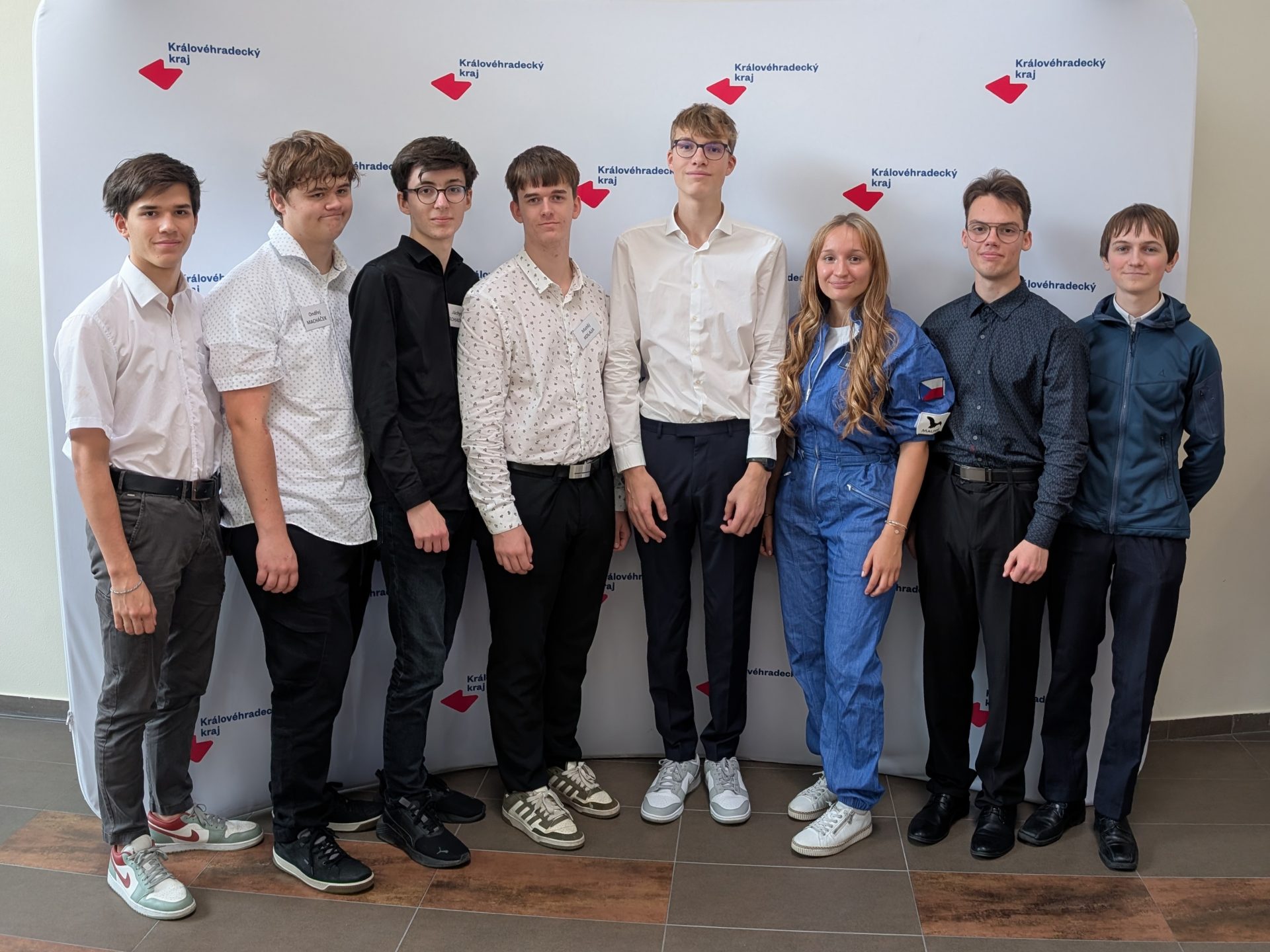 Ve středu 24. 9. a 15. 10. se v sále Jana Letzela na Krajském úřadě Královéhradeckého kraje konalo slavnostní setkání vítězů soutěží z řad studentů. Z našeho gymnázia byli oceněni za umístění na prvních místech Emma Burešová (Biologická olympiáda), 4x Antonín Kubeček (Matematická a Chemická olympiáda, Technologická olympiáda, Středoškolská odborná činnost – obor Matematika), Matěj Kolaja, Ondřej Macháček, Jáchym Bohadlo, Štěpán Strnad (Robotiáda), Daniel Matjaš, Lukáš Král (Technologická olympiáda), Eva Hrnčířová (za účast na projektu Zero-G). Na oceněné studenty čekaly poukázky do AlpinePro a také opravdu bohatý raut na závěr akce. Všem oceněným studentům gratulujeme!
