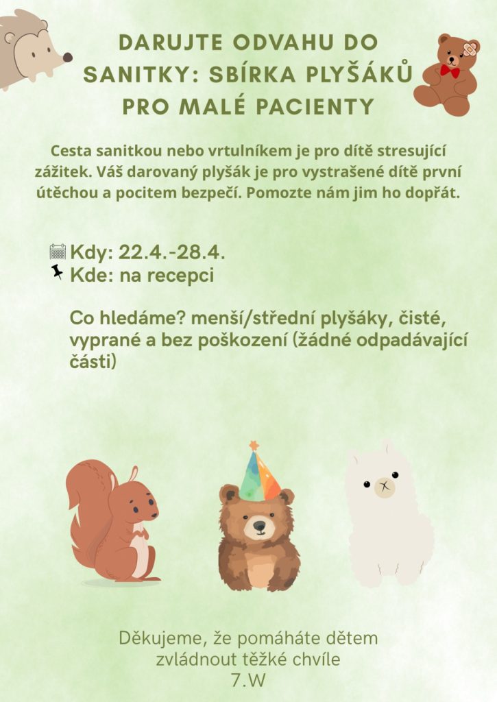 Sbírka plyšáků - darujte odvahu do sanitky Cesta sanitkou nebo vrtulníkem je pro dítě stresující zážitek. Váš darovaný plyšák je pro vystrašené dítě první útěchou a pocitem bezpečí. Pomozte nám jim ho dopřát. Kdy: 22.4. – 28.4. Kde: na recepci JG Tisk Vloženo: 21.4.2026 Autor: Správce stránek Aktuality