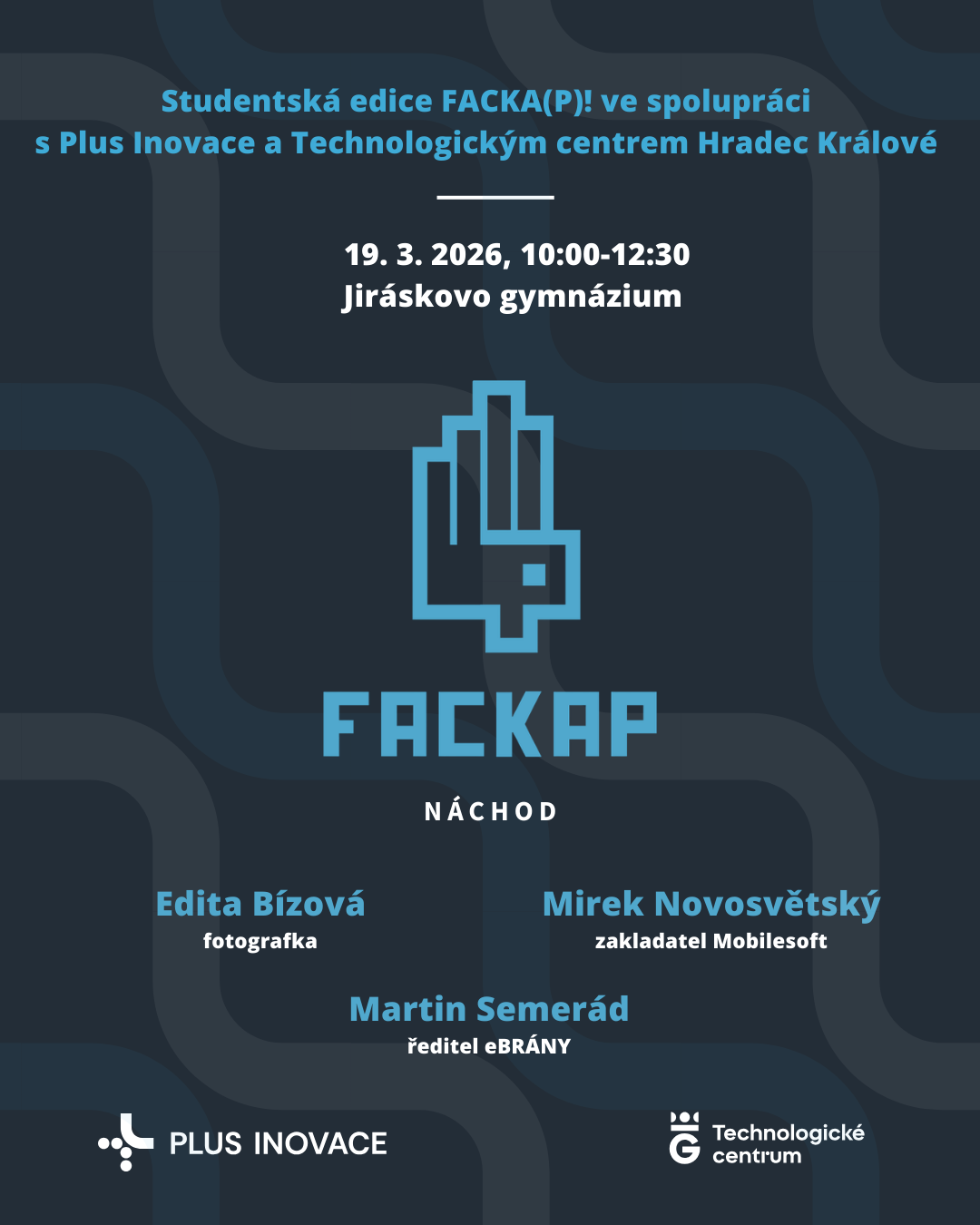 Že cesta k úspěchu nebývá přímá, ale plná slepých uliček a nečekaných pádů, se ve čtvrtek 19. 3. 2026 dozvěděli letošní maturanti. V aule našeho gymnázia totiž poprvé proběhla studentská edice populární akce FACKA(P)!, která vznikla ve spolupráci s organizacemi Plus Inovace a Technologickým centrem Hradec Králové. Cíl byl jasný: ukázat studentům svět podnikání bez růžových brýlí.