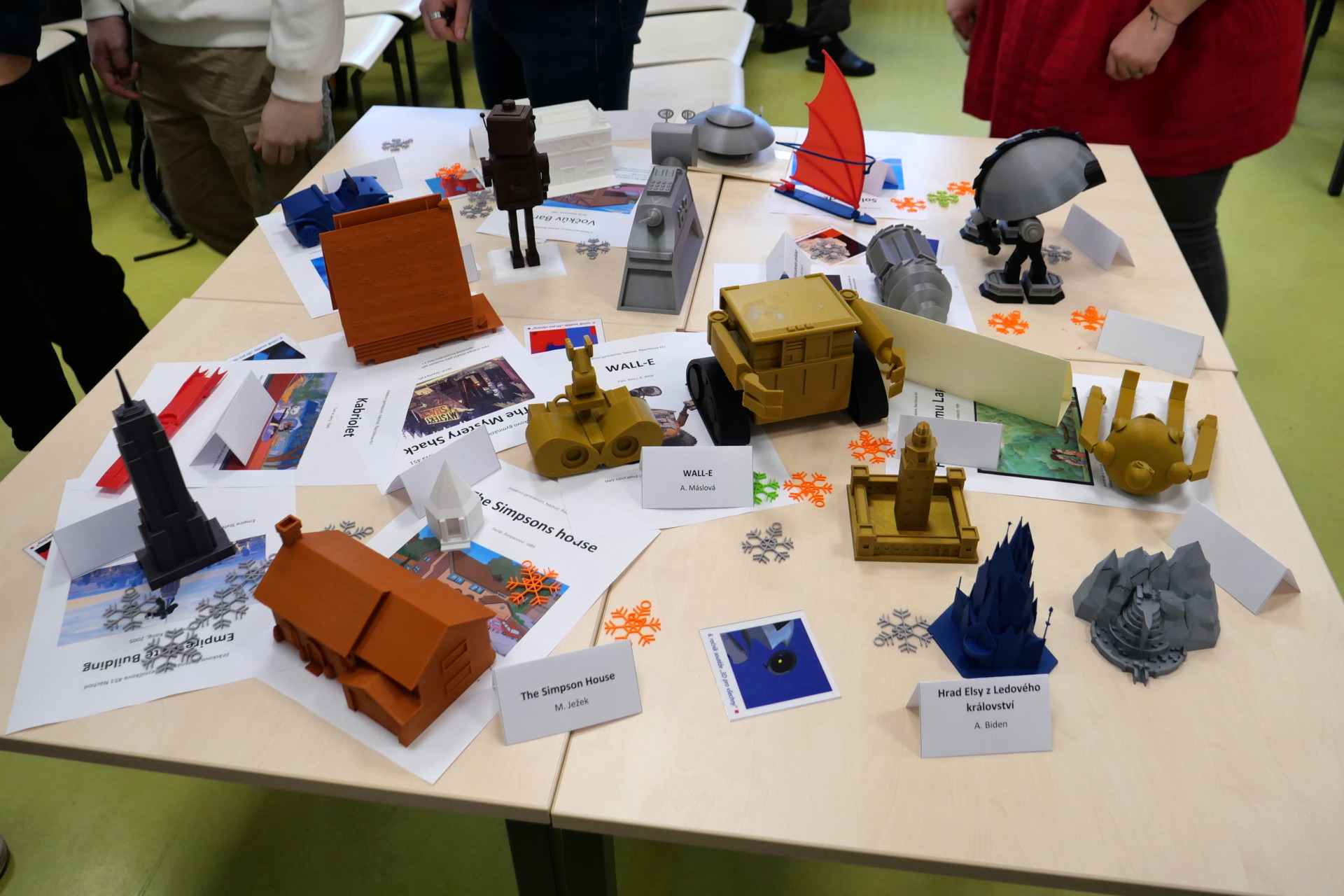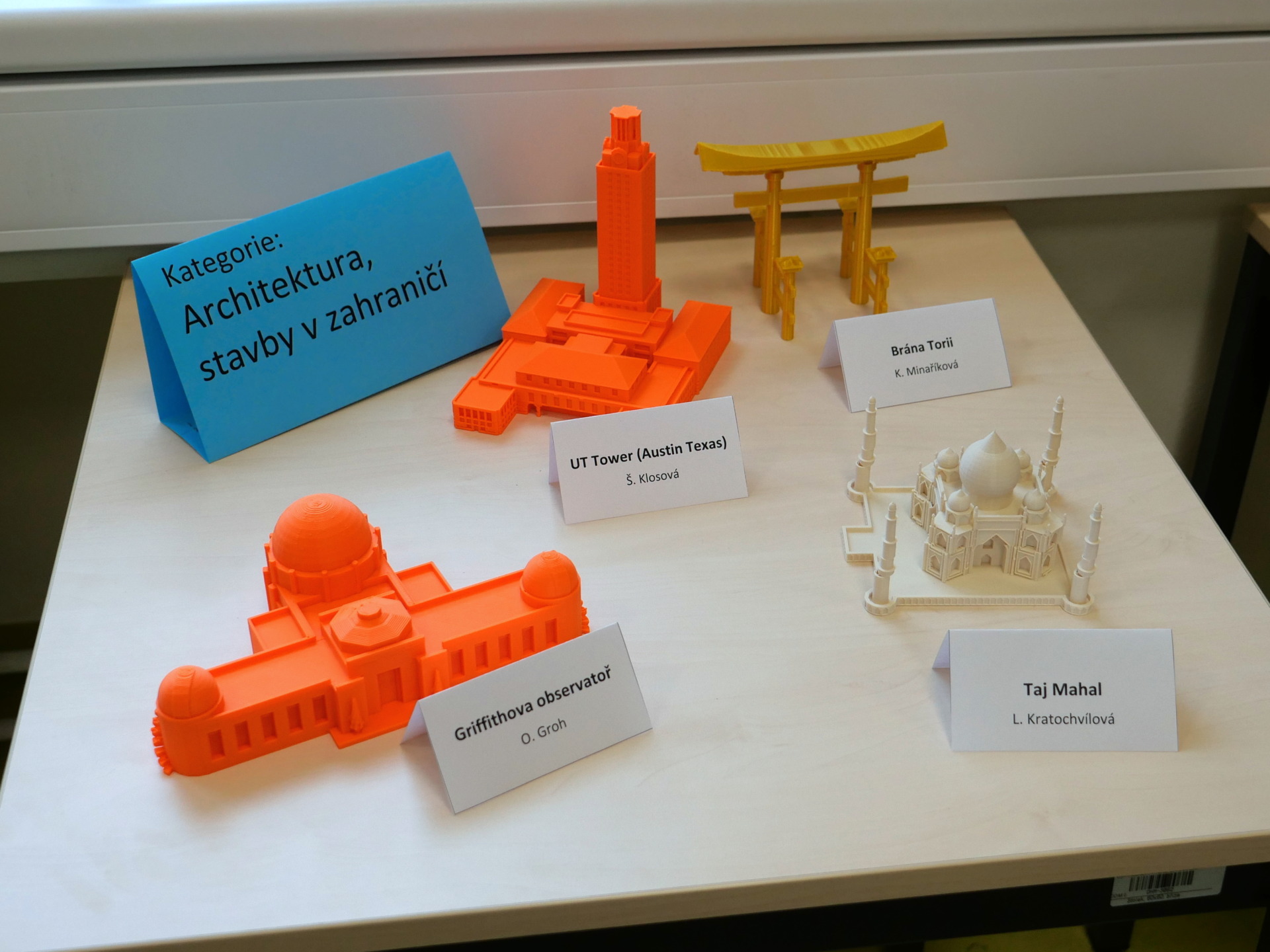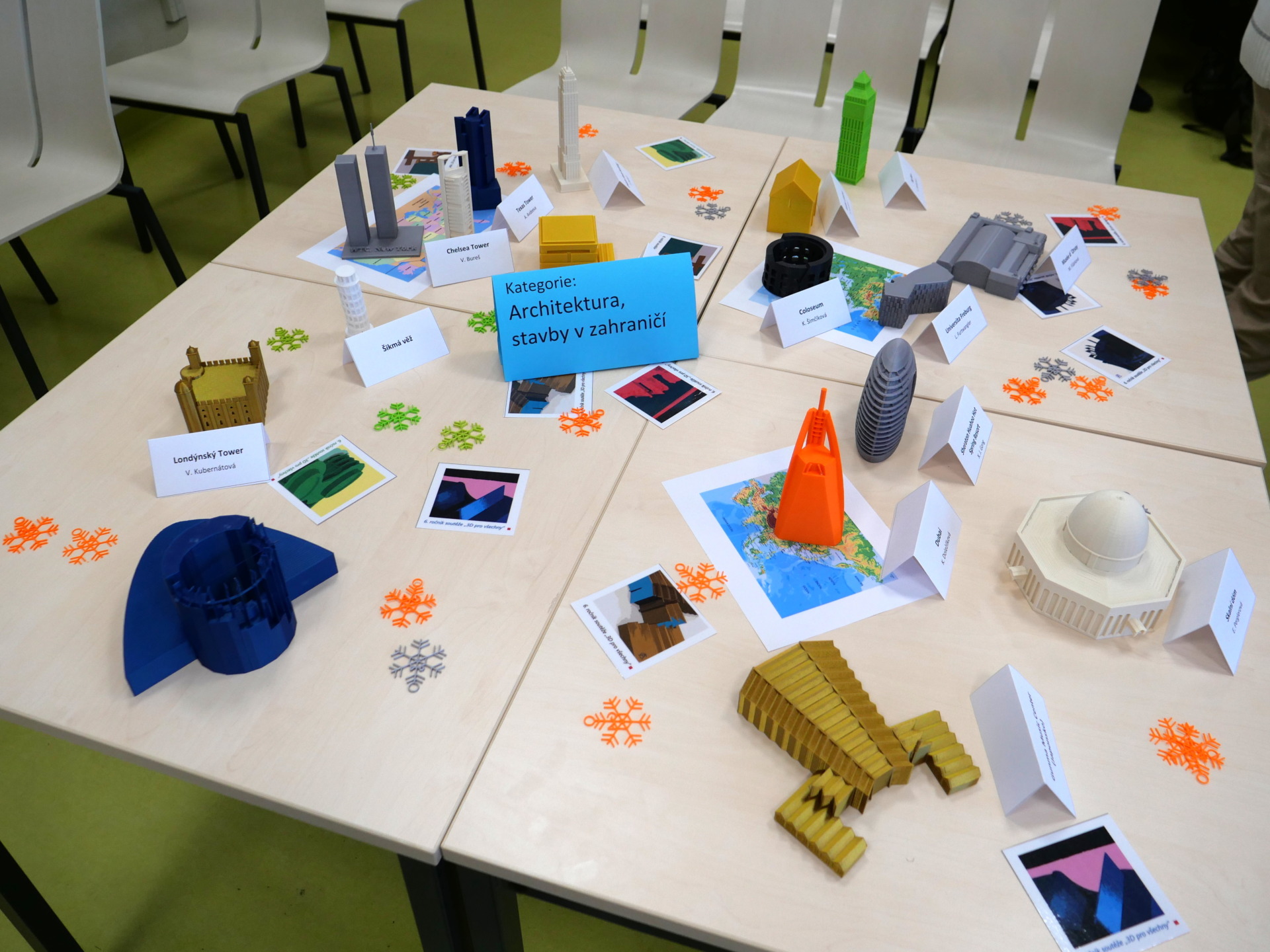 Poté nás čekala cesta na Gymnázium Arabská, kde v odpoledních hodinách proběhlo vyhlášení výsledků soutěže 3D pro všechny. Cílem soutěže je navrhnout 3D model v jedné z kategorií, vytisknout ho na 3D tiskárně a zaslat do soutěže. Některé 3D modely pak slouží jako výukové pomůcky na Gymnáziu Radlická pro zrakově postižené a na ZŠ pro žáky s poruchami zraku na Praze 2. Úsilí studentů při vytváření a tisku 3D modelů tak umožní poznávat svět jejich zrakově postiženým vrstevníkům. Jak napsal jeden z našich studentů, Martin Ježek: “Dva nevidomí žáci byli dokonce přítomni na vyhlašování, a o to silnější zážitek to byl, když jsme mohli vidět jejich první reakce poté, co si poprvé vzali do ruky nám dobře známé modely památek nebo strojů, které si do té doby mohli pouze představovat.“