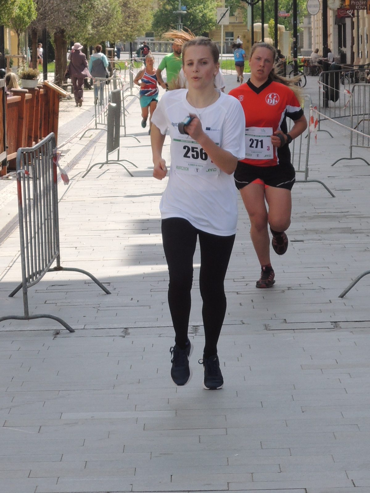 Do druhé půlky závodu díky vynikajícím výkonům předešlých běžců vbíhal Pepa Mrázek současně s běžcem na 3. pozici. V tu chvíli znervózňujeme, protože má brzy běžet Kamila Šimková, která jakožto multifunkční student našeho gymnázia stihla ještě v dopoledních hodinách absolvovat krajské kolo fyzikální olympiády. Nakonec dorazila včas a svůj úsek zaběhla výborně.